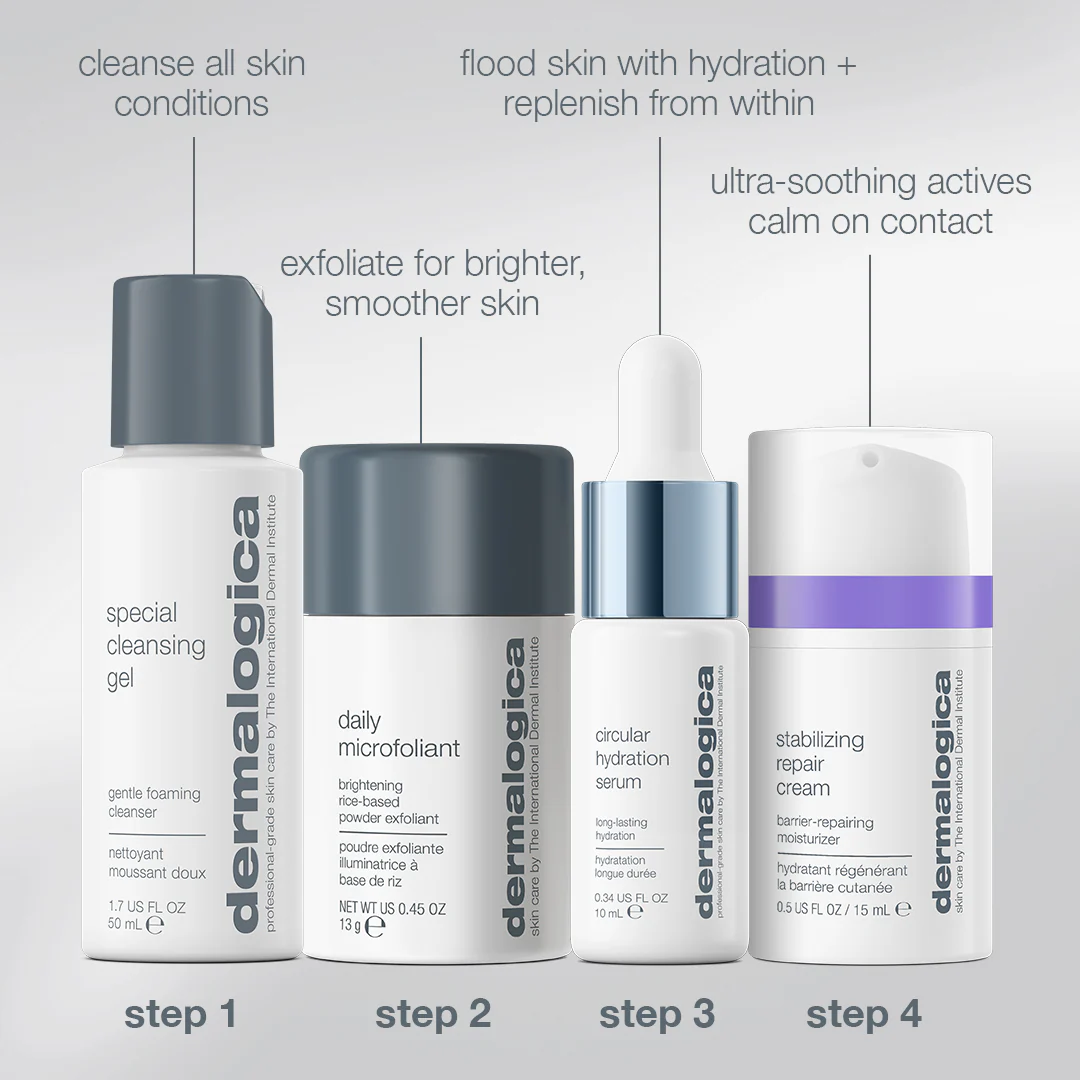 Gently lather a small amount of Special Cleansing Gel in moistened hands and apply to dampened face and throat. Rinse with warm water. Dispense about a half-teaspoon of Daily Microfoliant into very wet hands and create a creamy paste by rubbing hands together. Apply to face in circular motions, avoiding the eye area. Massage gently for one minute, then rinse thoroughly. Smooth Circular Hydration Serum over cleansed face and neck morning and night. Rub Stabilizing Repair Cream between hands then apply to face and neck with light, upward strokes. Use once or twice daily. Keep out of eyes.