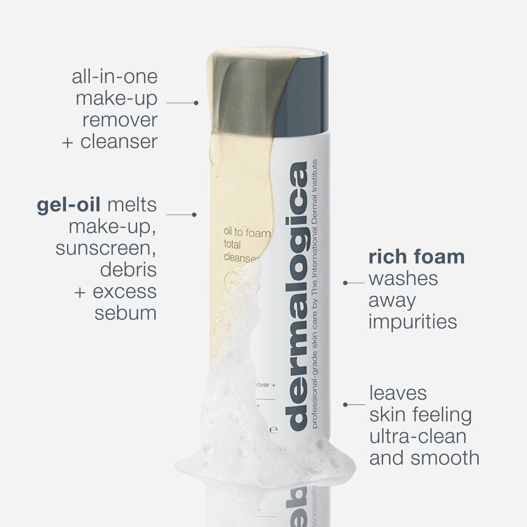 Satu cucian dengan Oil to Foam Total Cleanser menghilangkan solekan, pelindung matahari, serpihan, sebum berlebihan, dan pencemar.* Ikuti dengan Daily Microfoliant, pengelupasan serbuk #1 kami, untuk melembutkan dan mencerahkan kulit.